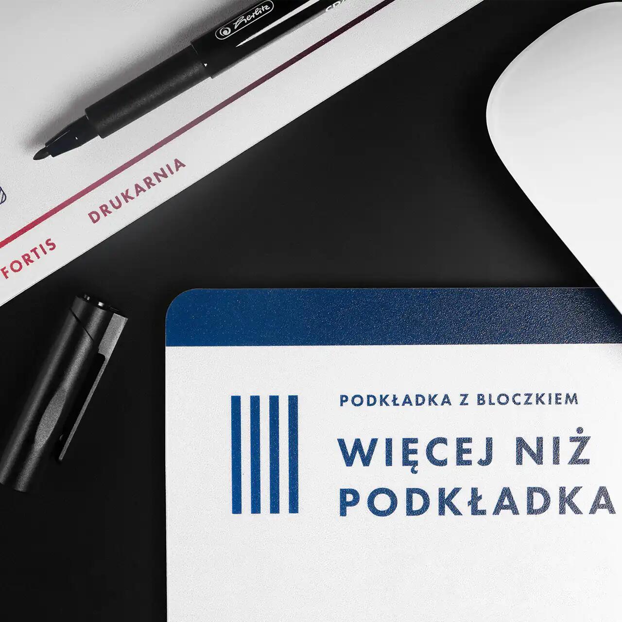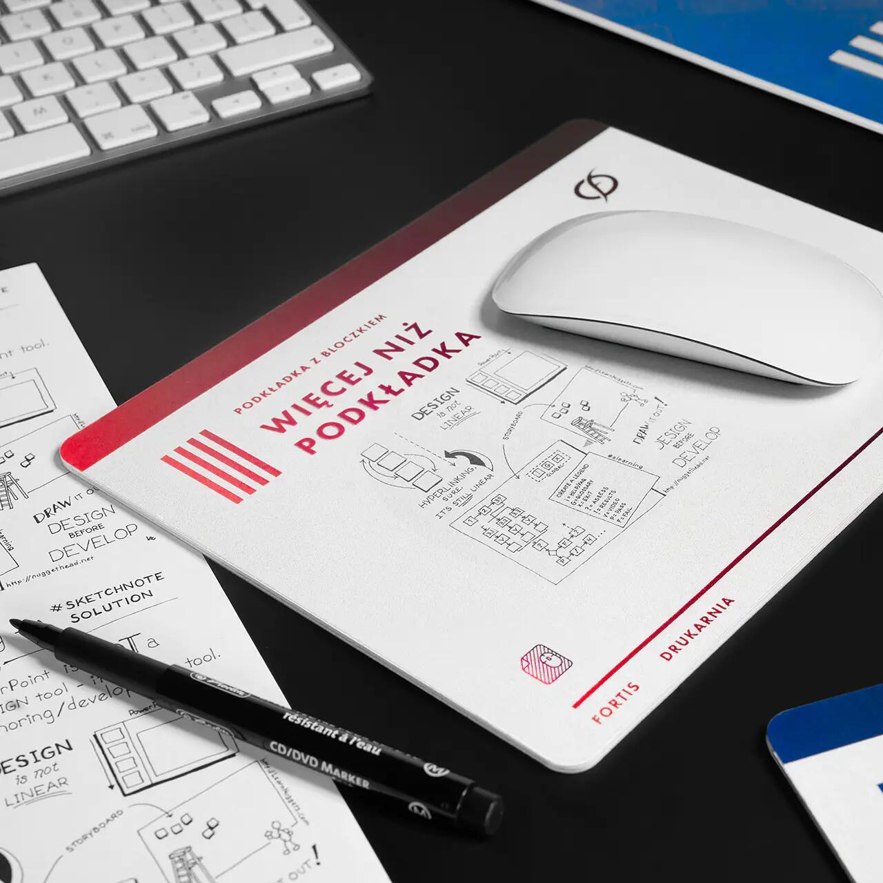 Niewiele jest gadżetów reklamowych skuteczniejszych od podkładki pod mysz, a nasza propozycja jest jeszcze bardziej praktyczna. Nadruk wykonujemy bezpośrednio na folii PCV o grubości 0,3mm. Dodatkowo w tym modelu wklejamy bloczek z kalendarzem, notesem, albo firmowym katalogiem, podklejając od spodu szarą, antypoślizgową mikrogumą usztywnioną białym PVC.